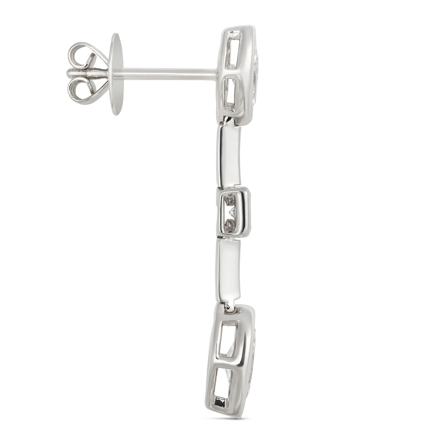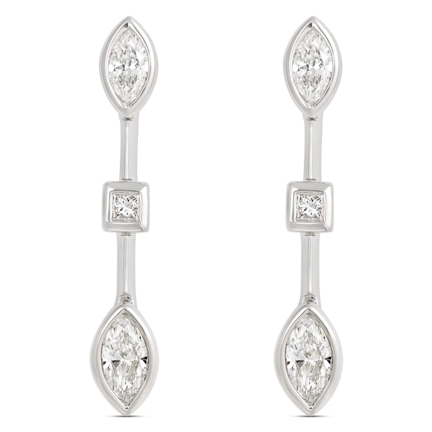 Put ultimate elegance and style on display with this gorgeous pair of triple drop diamond earrings featuring two marquise diamonds and a princess cut diamond, each in a 14k white gold bezel setting. You’re looking at an heirloom quality pair of earrings featuring 1.10 carat weight of exceptional, natural and responsibly sourced gemstones.