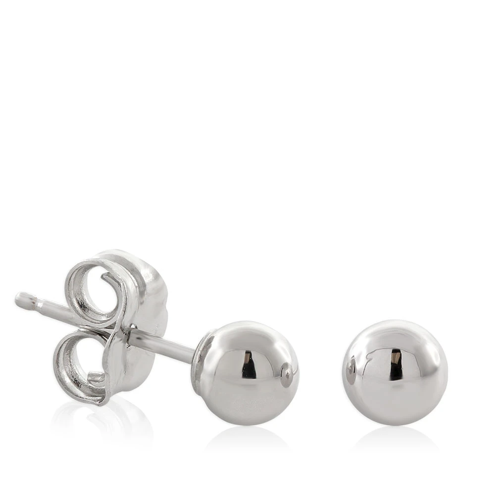 White gold sphere stud earrings 4mm in diameter, in 14K white gold with solid post.