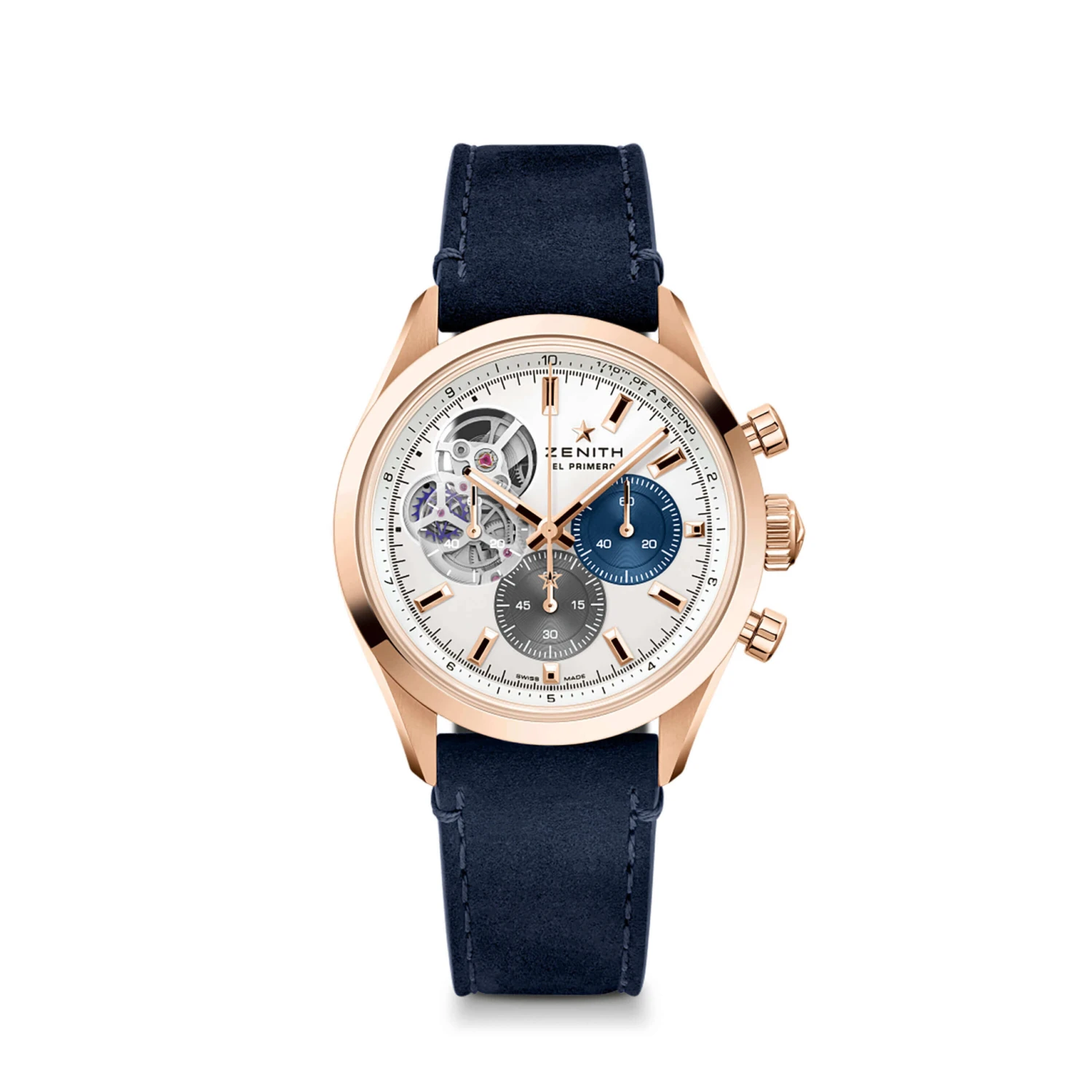 The CHRONOMASTER Open offers a view of the beating heart of the El Primero movement from the dial. Crafted in a sleek 39.5mm 18K rose gold case, this version features a matte silver dial with tricolour counters and a transparent counter for the running seconds, paired with a blue calfskin leather strap. Powered by the El Primero 3604 1/10th of a second automatic chronograph movement.