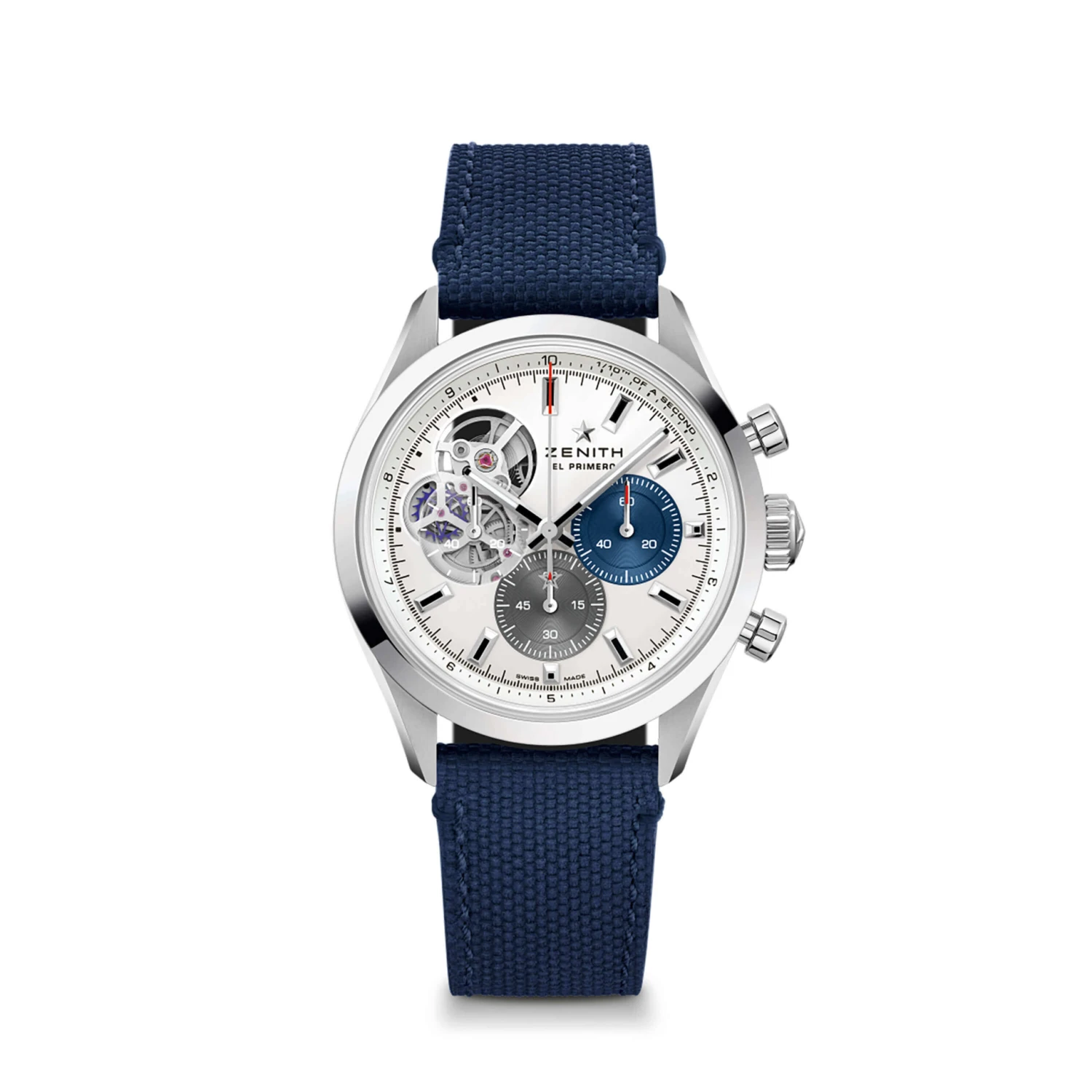 The CHRONOMASTER Open offers a view of the beating heart of the El Primero movement from the dial. Crafted in a sleek 39.5mm steel case, this version features a matte silver dial with tricolour counters and a transparent counter for the running seconds, paired with a blue cordura-effect rubber strap. Powered by the El Primero 3604 1/10th of a second automatic chronograph movement.