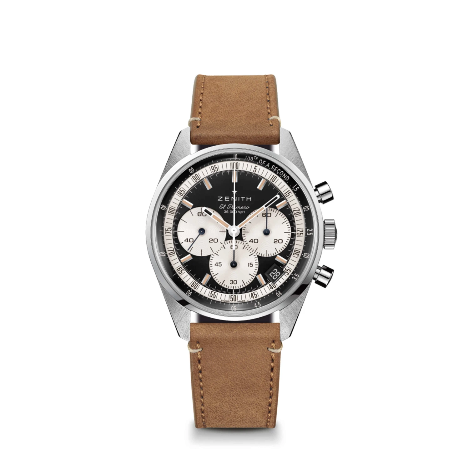 The CHRONOMASTER Original is crafted in a 38mm steel case in the same proportions as the A386, paired with a black “reverse panda” dial and a tan leather strap. Powered by the El Primero 3600 automatic high-frequency chronograph movement with 1/10th of a second chronograph function and a power reserve of 60 hours.
