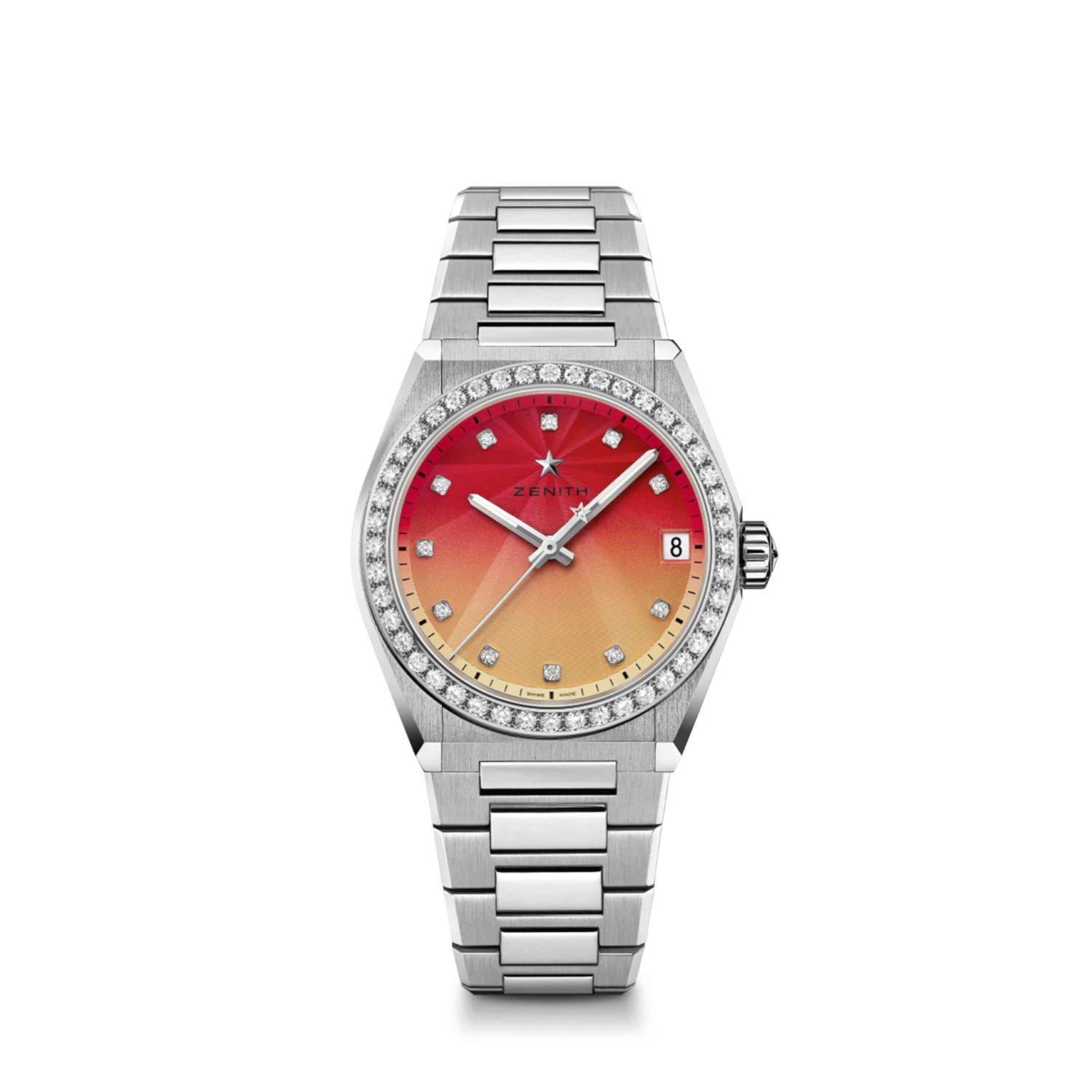 The DEFY Midnight Sunset is crafted in a 36mm steel case with a diamond-set bezel, featuring a guilloché engraved dial with a vertical colour gradient shifting from red to yellow. The DEFY Midnight women’s watch comes with a steel bracelet with multiple straps than can easily be swapped without requiring any tools. Powered by the ELITE automatic manufacture calibre.