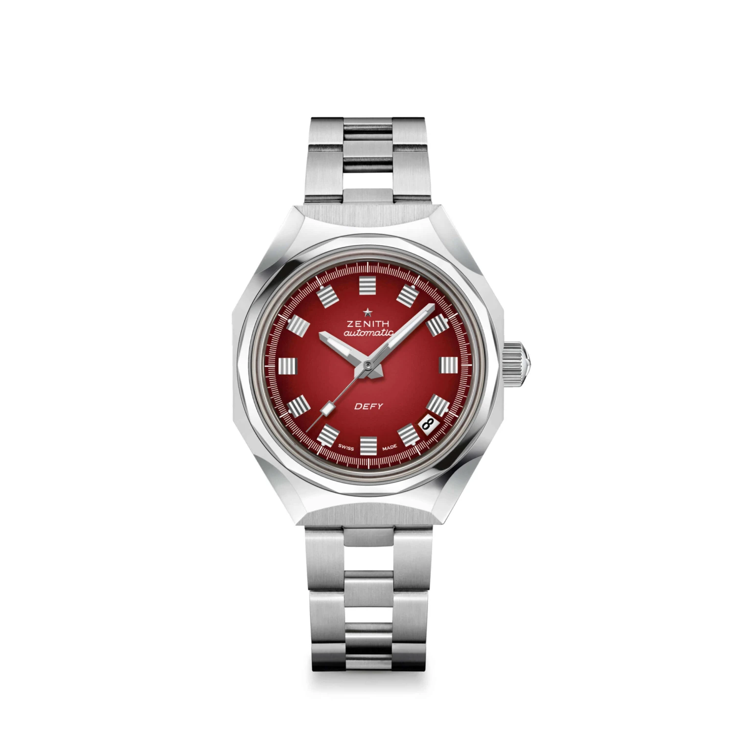 A faithful reproduction of one of the first DEFY wristwatch with a coloured dial. Crafted in a robust octagonal stainless steel case with 14-sided bezel and paired with a deep red gradient-effect dial and steel ladder bracelet. Powered by the ELITE 670 automatic manufacture movement.